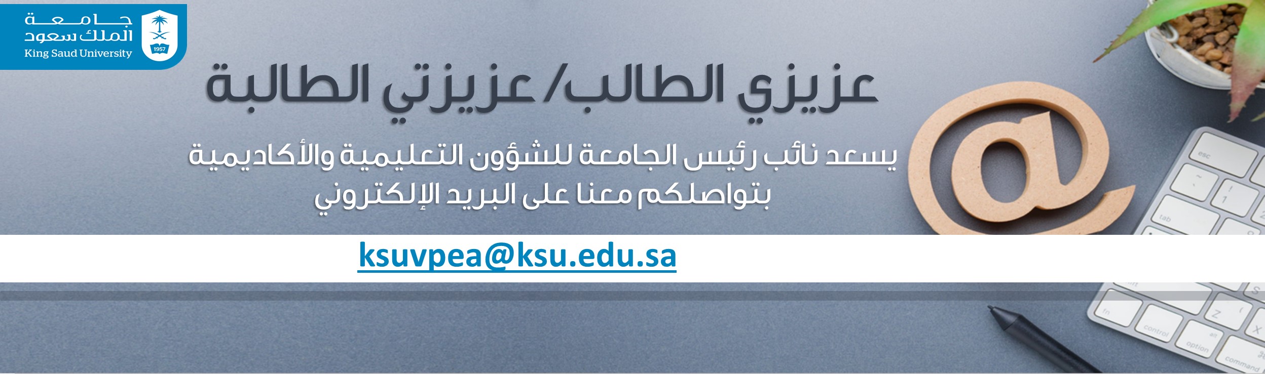 تواصل الطلاب والطالبات عزيزي الطالب ... عزيزتي الطالبةيمكنك التواصل مع مكتب نائب رئيس الجامعة للشؤون التعليمية والأكاديمية عند وجود أي استفسار وذلك باستخدام بريد الطالب الجامعيksuvpea@ksu.edu.sa